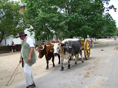Oxen were commonplace in British colonies starting in the 1600s. Plantation owners and small farmers relied on them for all sorts of tasks as well as for milk, meat, hides, and fat. During the Revolutionary War, oxen hauled supplies; they were links in the Continental Army's logistical network. In September 1781, Williamsburg citizens saw what was probably the largest assemblage of cattle in the town's history when George Washington's supply column passed through on its way to the Battle of Yorktown.