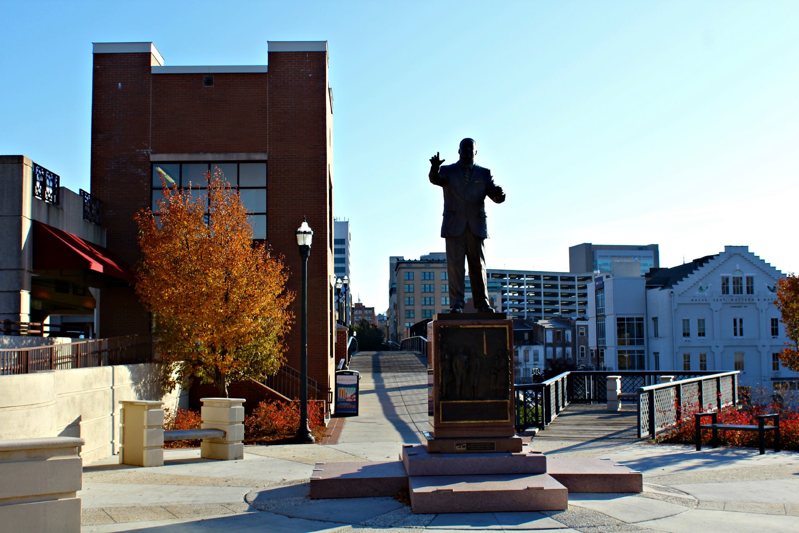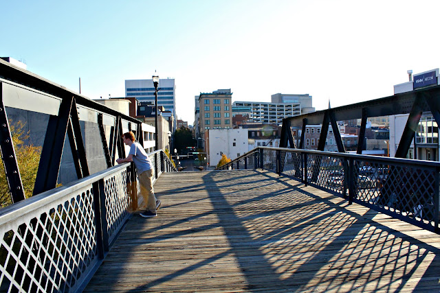"History: The former First Street Bridge (which was also called the Henry Street Bridge) underwent a $4 million renovation in 2007 and reopened as a pedestrian bridge renamed in honor of the slain civil rights leader. The narrow bridge once provided a vehicle crossing over the railroad tracks between downtown and the Gainsboro neighborhood, where Henry Street was the retail and entertainment hub for many black Roanokers before “urban renewal” projects wiped out much of the neighborhood. The bridge was repaired numerous times over the decades and was closed to traffic in 2000. Since reopening in February 2008, the bridge has been a primary walkway for people who live in apartments in the renovated Norfolk and Western headquarters, who attend classes at the Roanoke Higher Education Center or who just want to admire the bronze statue of King at the north end of the bridge and listen to recordings of his speeches. It is the last steel truss bridge in Roanoke." Found that HERE along with a list of historic bridges in Roanoke...I need to make that my mission to visit each one and snap a photo!